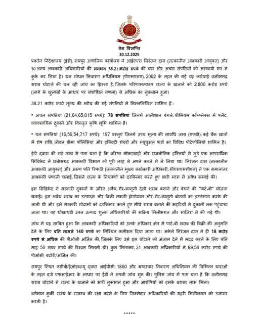 ED ने प्रेस नोट जारी कर बताया कि, रायपुर आंचलिक कार्यालय ने आईएएस निरंजन दास (तत्कालीन आबकारी आयुक्त) और 30 अन्य आबकारी अधिकारियों की लगभग 38.21 करोड़ रुपये की चल और अचल संपत्तियों को अस्थायी रूप से कुर्क कर लिया है. धन शोधन निवारण अधिनियम (पीएमएलए), 2002 के तहत की गई यह कार्रवाई छत्तीसगढ़ शराब घोटाले की चल रही जांच का हिस्सा है, जिसके परिणामस्वरूप राज्य के खजाने को 2,800 करोड़ रुपये (आगे के खुलासों के आधार पर संशोधित गणना) से अधिक का नुकसान हुआ.