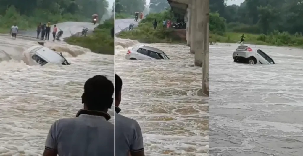 जानकारी के मुताबिक, उड़ीसा नंबर की स्विफ्ट कार में सवार तीन लोगों ने जोखिम उठाते हुए पुल के ऊपर से बहते पानी को पार करने की कोशिश की. तेज बहाव में कार अचानक बेकाबू होकर नाले में बह गई. मौके पर मौजूद लोगों में हड़कंप मच गया, गनीमत रही कि कार सवार तीनों व्यक्ति तैरकर सुरक्षित बाहर निकल आए. इस खतरनाक घटना का वीडियो भी सामने आया है, जिसमें साफ दिख रहा है कि चालक ने भारी लापरवाही बरती है.