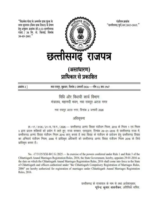 Chhattisgarh: छत्तीसगढ़ की साय सरकार ने राज्य में शादियों के पंजीकरण को लेकर एक बड़ा फैसला लिया है. जहां अब छत्तीसगढ़ में शादी का रजिस्ट्रेशन अनिवार्य कर दिया गया है. राज्य सरकार के विधि-विधायी कार्य विभाग ने इस संबंध में राजपत्र में अधिसूचना जारी कर दी है.